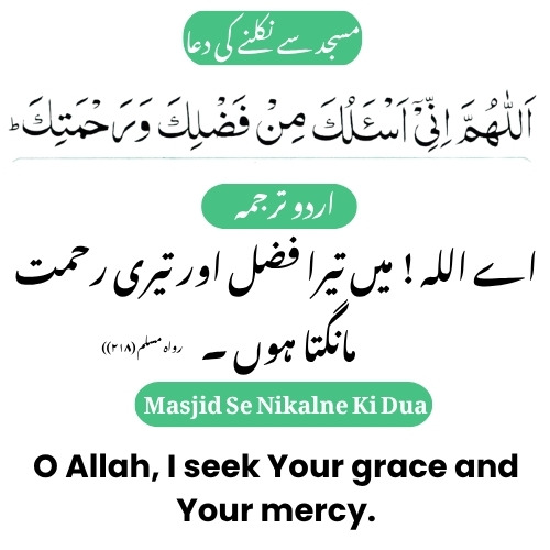 This dua should be recited when leaving the masjid (mosque) after offering prayers or any visit for worship. It’s a short and simple sunnah dua that Prophet Muhammad ﷺ used to read while exiting the mosque.